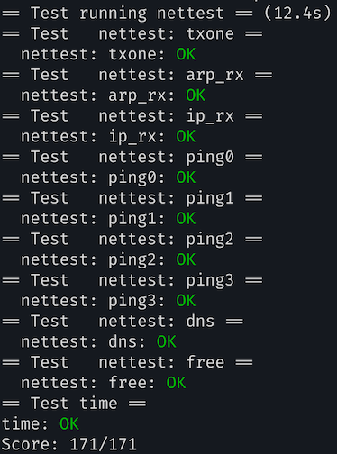 1 2 3 4 5 6 7 8 9 void netinit (void ) { initlock(&netlock, "netlock" ); memset (ports_info, 0 , sizeof ports_info); for (int i = 0 ; i < NPROC; ++i) { initlock(&ports_info[i].port_lock, "net_portlock" ); } }