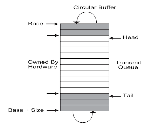 对于发包的场景,E1000 管理一个环形缓冲区。这个环形缓冲区用来存放