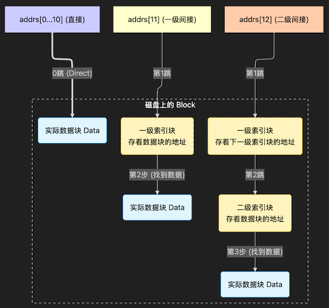 // On-disk inode structure structdinode { short type; // File type short major; // Major device number (T_DEVICE only) short minor; // Minor device number (T_DEVICE only) short nlink; // Number of links to inode in file system uint size; // Size of file (bytes) uint addrs[NDIRECT + 2]; // Data block addresses };